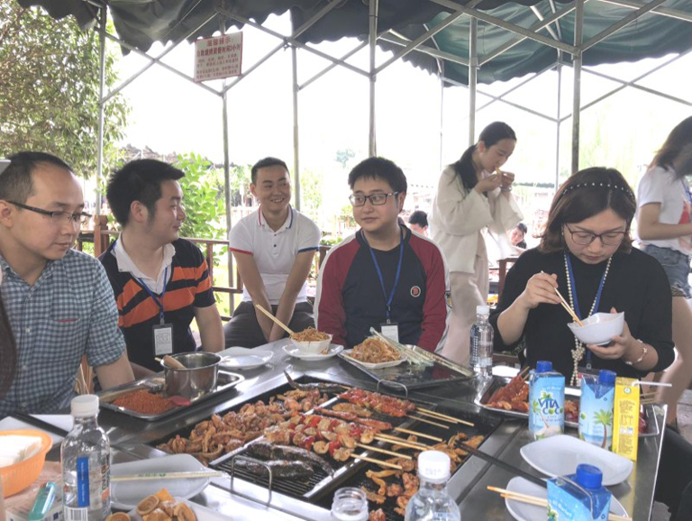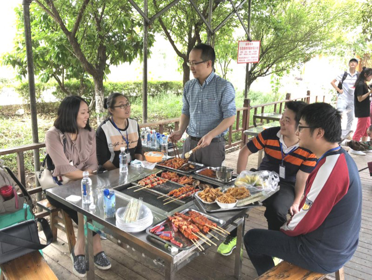 烧烤开始了,大家展示了不同的烧烤方法和技艺,品尝着相互合作下的一份份美味佳肴,聊着生活和工作中的一些趣事,欢声笑语随着缕缕炊烟萦绕在空中,好不happy。